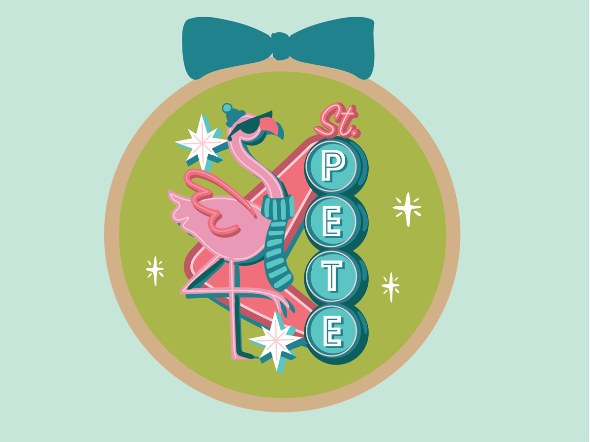 Let’s flamingle this holiday season! Inspired by “Ten Lords a-Leaping,” a retro-style flamingo strikes a pose in front of a neon “St. Pete” sign inspired by the vintages signs around the city. You can spot this beautiful birds at the Sunken Gardens. These quirky mascots are thriving, just like St. Pete’s funky, eclectic vibe. It’s the perfect way to add a touch of pink power to your decor!